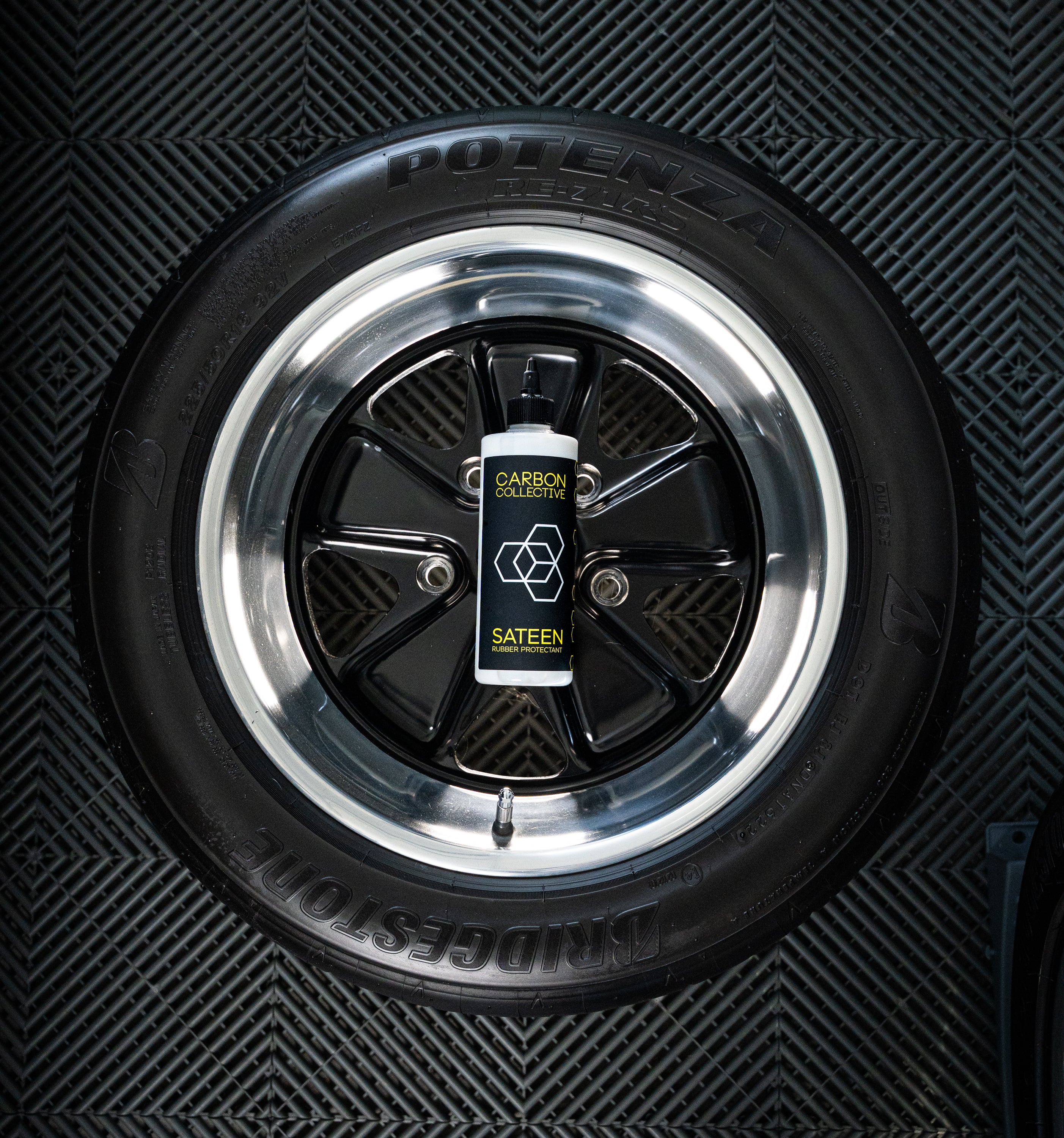 Sateen Rubber & Tire Protectant is unlike any other tire dressing product on the market. Our revolutionary new formulation creates a durable, hydrophobic coating that bonds to the surface and darkens the appearance of tires. The coating cures to become dry to the touch, ensuring no sling or transfer, unlike traditional tire dressings.