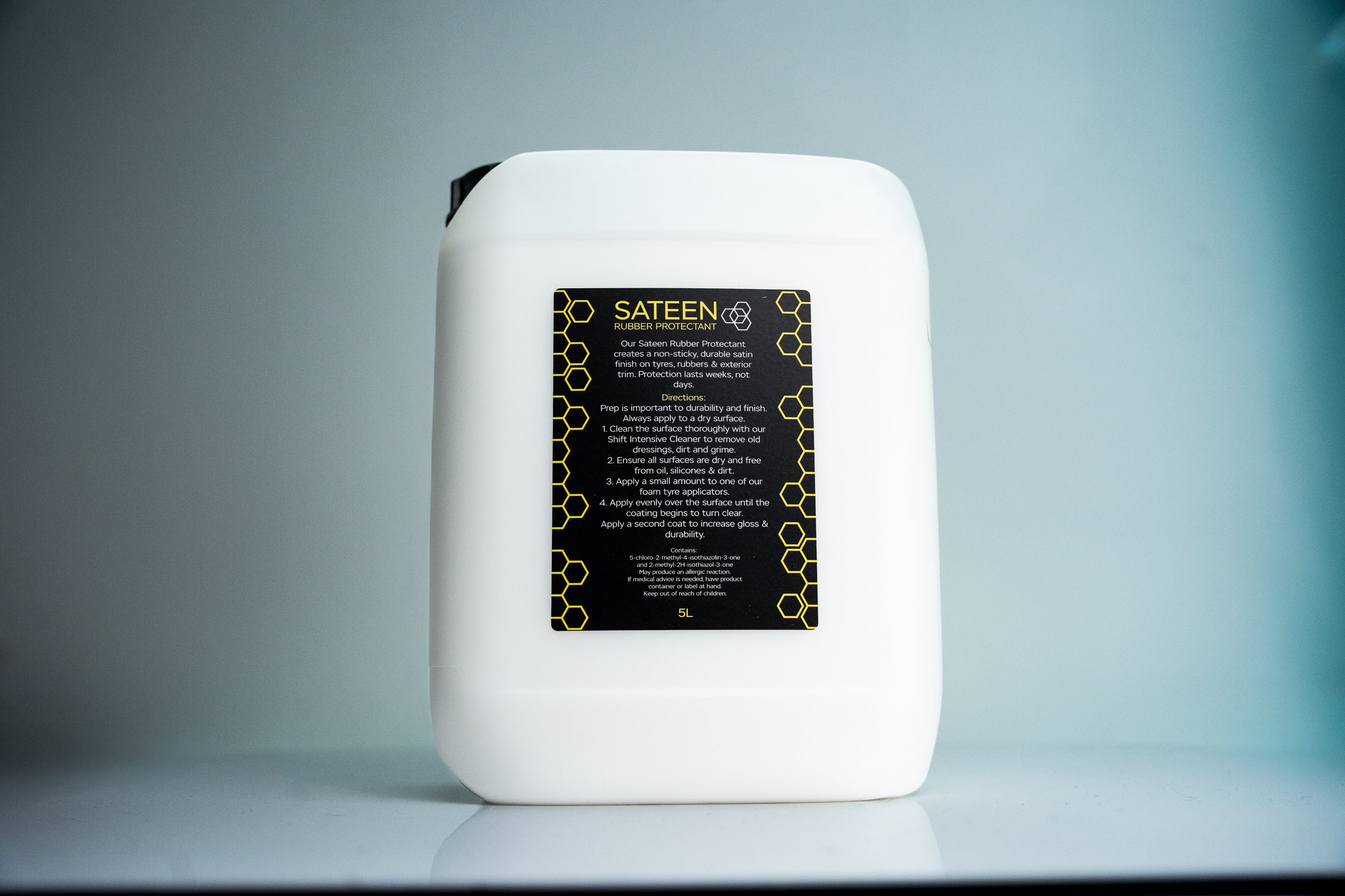 Sateen Rubber & Tire Protectant is unlike any other tire dressing product on the market. Our revolutionary new formulation creates a durable, hydrophobic coating that bonds to the surface and darkens the appearance of tires. The coating cures to become dry to the touch, ensuring no sling or transfer, unlike traditional tire dressings.